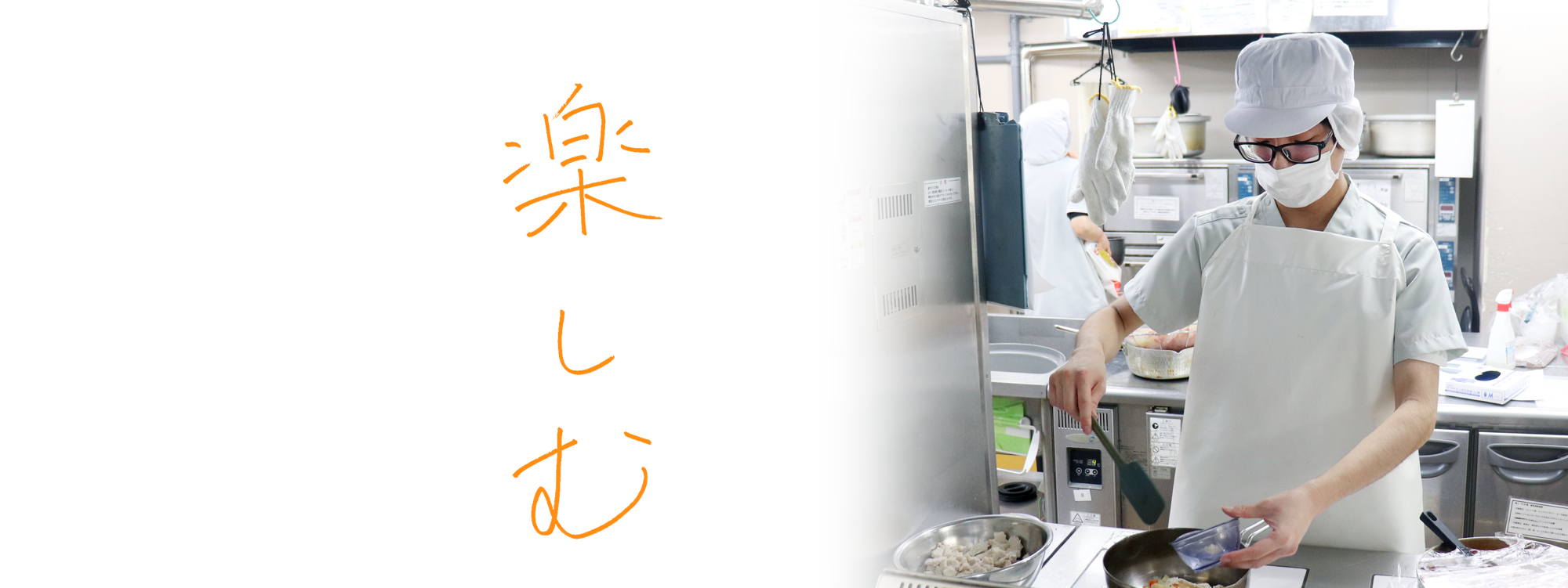 厨房業務や洗浄業務が主です。厨房業務では、キザミ食やミキサー食の作成・主食の盛り付け・小児調理・主調理等を行っております。